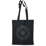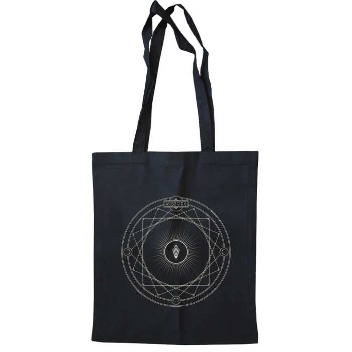 Extended, beige version of the WISBORG logo, printed on a black Westford Mill tote bag (100% cotton). The handles are long enough to fit over your shoulders.